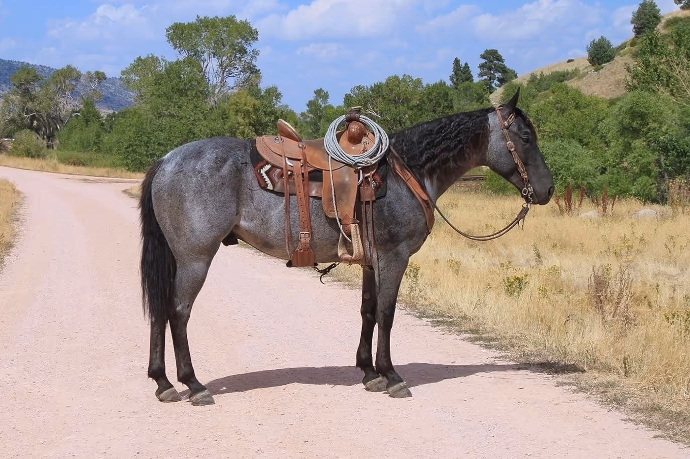 McCall is a reliable, country-covering blue roan with a steady nature and willingness to go wherever we want. He’ll sidle up to the mounting block for you to easily mount, then happily carry you wherever the day’s adventure leads, all while keeping a pleasant balance of pep-in-his-step but not hot or jiggy. He rides soft off your reins, gets a gate like a pro, and is great with natural and man-made obstacles. He lopes correctly and has a nice natural head carriage. McCall rides out from the barn alone without a fuss, and has been laid off for whatever time I need without trouble. He’s content to ride in an arena, but he’s even happier outside with a trail ahead of him and places to be. He loves to be loved on and has a sweet temperament that I enjoy! Ridden by Hadleigh True. FMI [email protected] or 307-298-5030.
