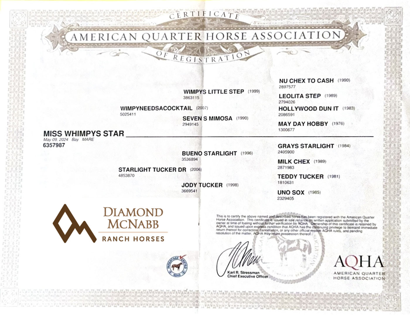 If you’re looking for a prospect that can go any direction — from the show pen to the ranch and everything in between — then Star is the horse for you! She has world champion bloodlines combined with classic conformation and a million-dollar disposition that will make her a treasure for your family for years to come. Star has a beautiful lope with a great stop, moves off your legs, and is soft in the bridle. She has been trai lridden, gathered cows, and held the herd. Star has the kind of foundation that has been the cornerstone of my training program for the past 30 years. Star is expected to mature to around 14.3 and be thickly built. The hard work is done —take her home and enjoy her. Started by Trent McNabb. FMI: contact Ken McNabb at 307-254-7260 | [email protected]