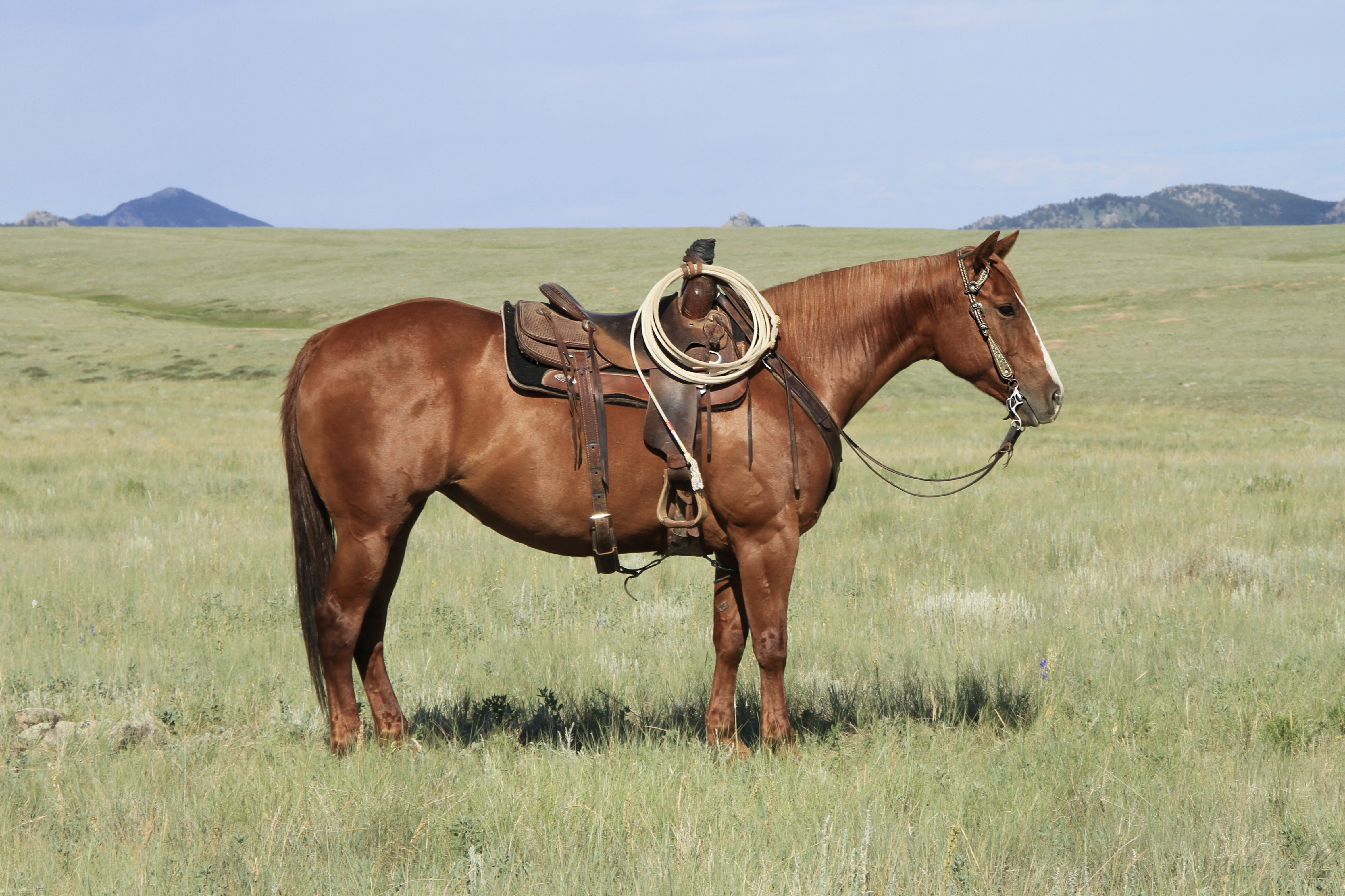 Homeraised and sweet as a honeypot, Rumba has been like a member of the Diamond family for eight years. There is no telling how many people have ridden her or how many miles of adventures she’s been on. Everyone from dudes to young kids, horsemen to extremely nervous guests have ridden Rumba. From the steepest trails on the mountain to the running herds of horses in off the meadows, to the hitting the drive thru and riding down the streets of town, she’s seen many sights. She is one of those gentle, sweet natured individuals that we can ride out with a large group or totally alone, everyday or once a year, and not have to worry about nonsense. She is user friendly with a very nice handle; correct and soft at a lope, stops off “whoa” and backs up off your seat… all with or without a bridle! She also sidepasses to the mounting block to make your life easier. Rumba is one of my best, and one of our last Playgun Will Travel daughters that will be offered. Ridden by Hadleigh True. For more information, please contact [email protected] or call 307-298-5030.