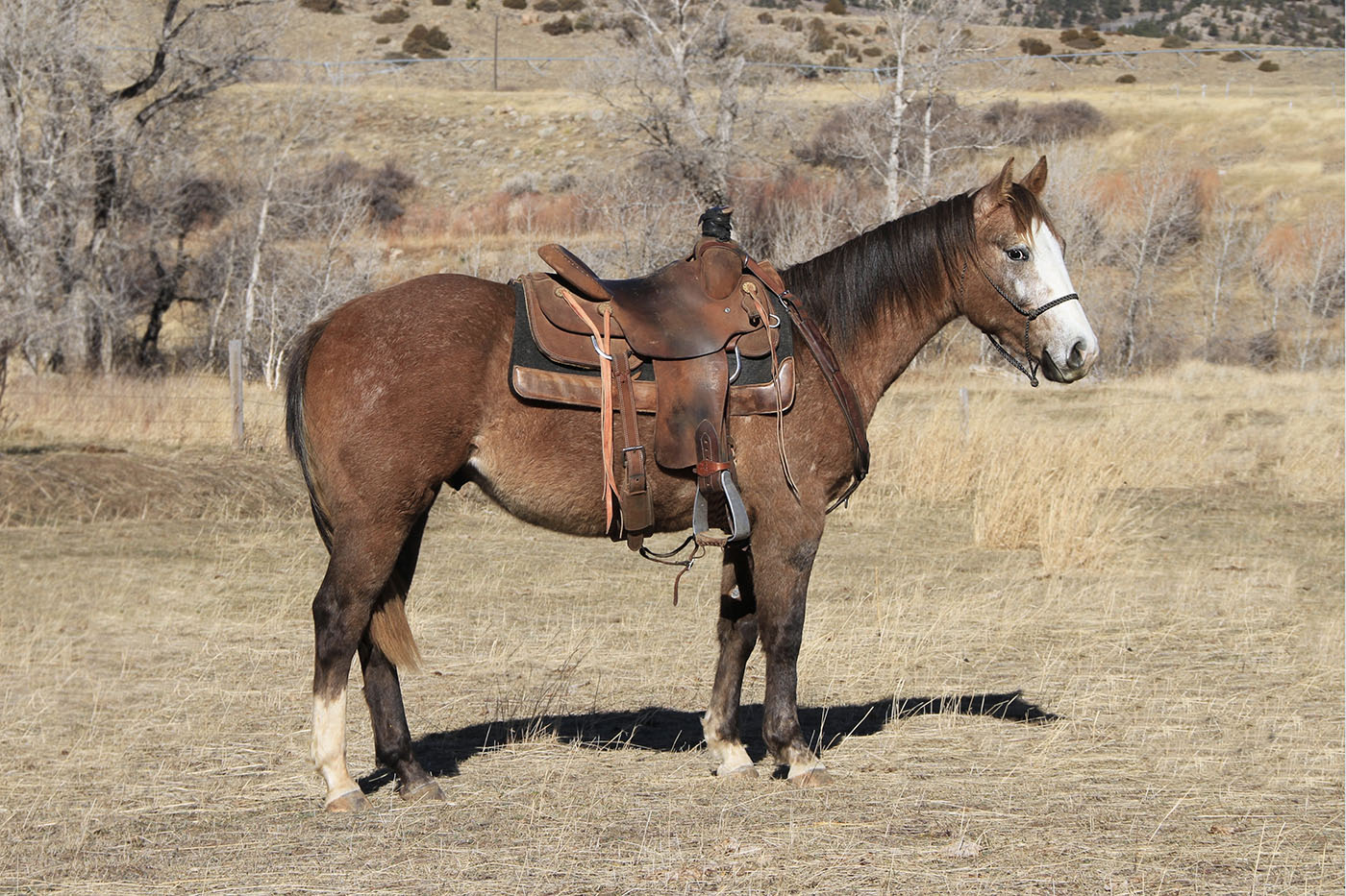Kind natured and eager to please, Blue Jeans is a homeraised two-year-old with a strong lineage of ranch and performance horse bloodlines. One of our favorite things about him is his gentle and willing mind. He has been a great little student and has every ingredient to continue making a reliable, all-around gelding! Blue Jeans is nice to catch, tie, saddle, groom and load, knows his groundwork, and has been exposed to numerous obstacles. He will have about 15 rides by sale day and his siblings have matured in the 14.3 to 15.1 hand range. We’ve had fun with this sensible young gelding, and think his next trainer will enjoy him! Started by Anna Frieden. FMI [email protected] or 307-298-5030.